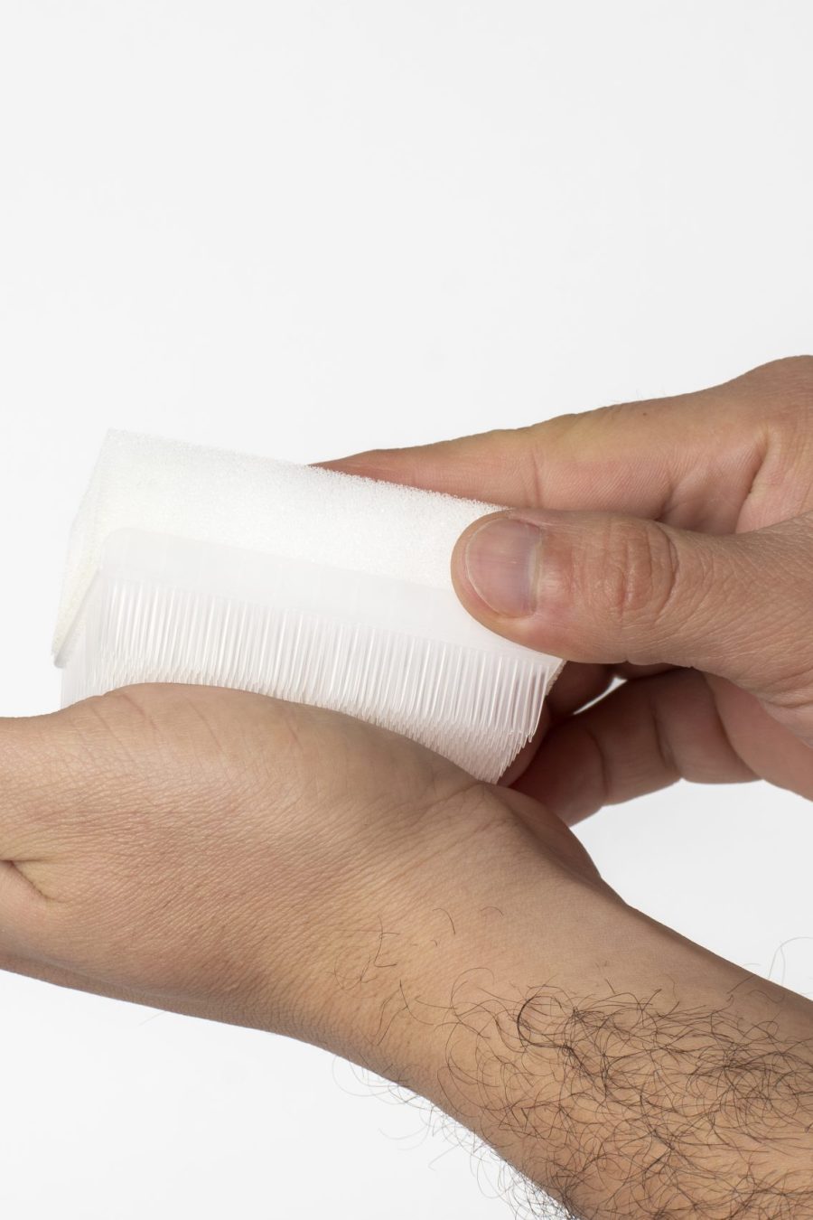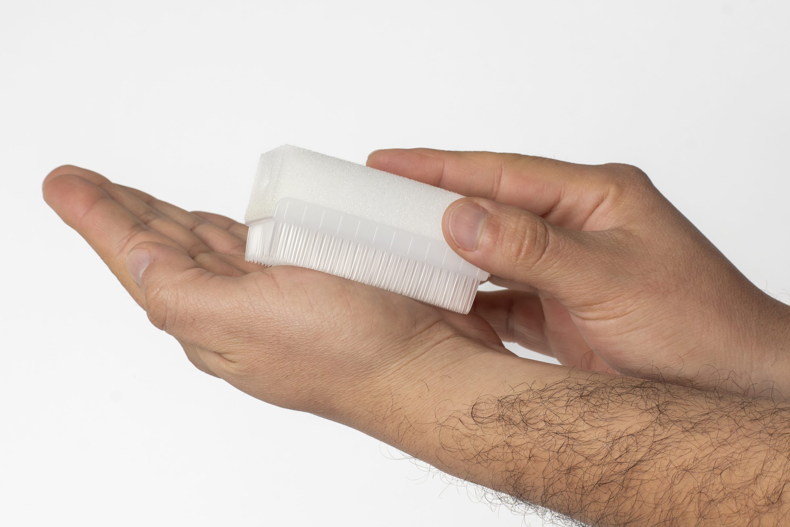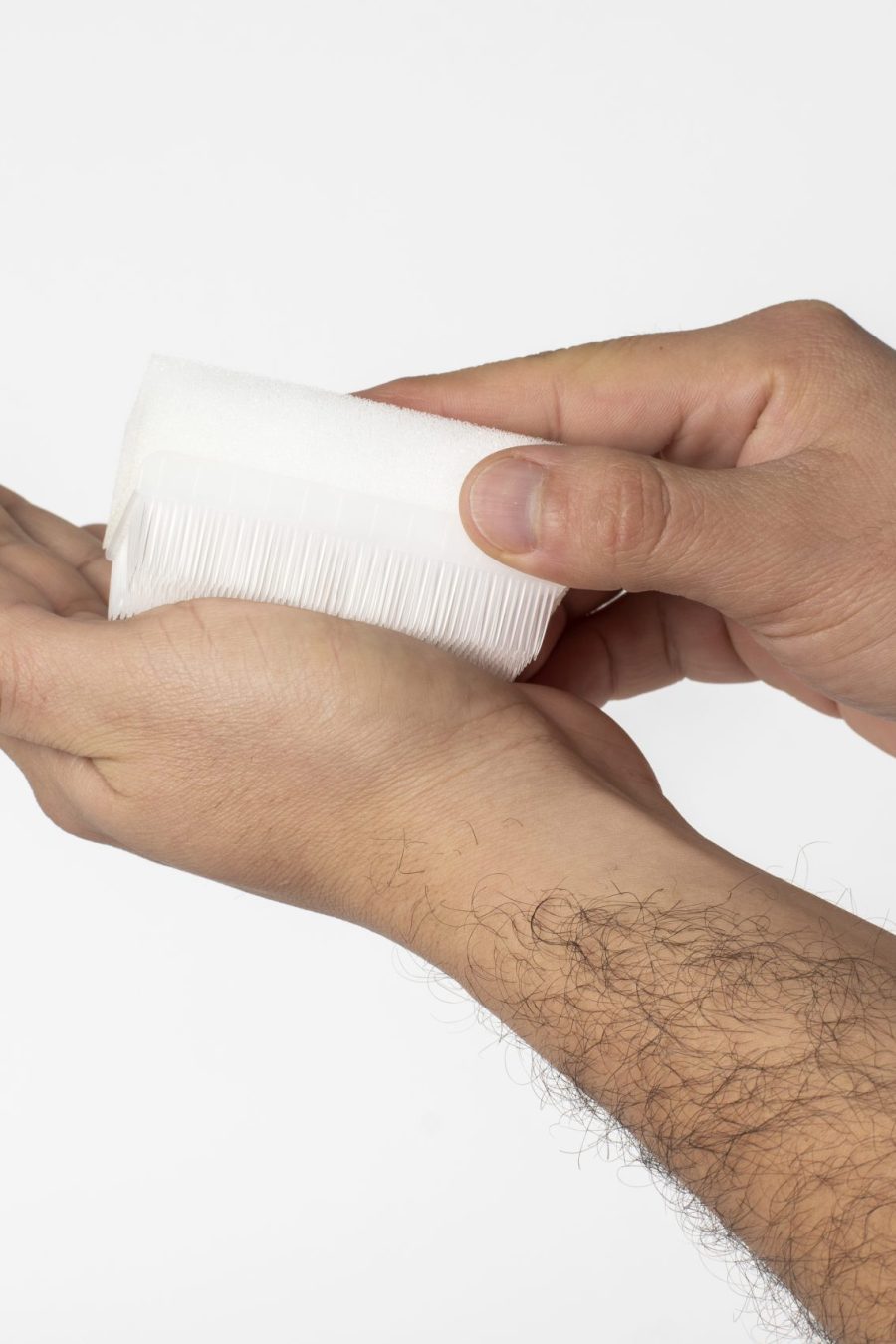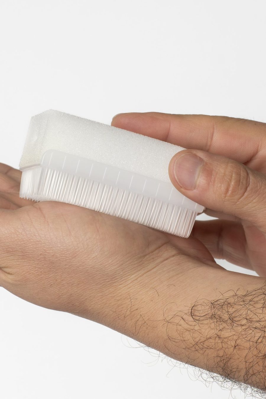Escobilla quirúrgica para la asepsia de las manos en el preoperatorio. Con cerdas flexibles de polietileno por una cara y esponja de poliuretano por la otra. Su diseño ergonómico permite una mayor comodidad del usuario. Incluye limpiador de uñas. Libre de látex y estéril.